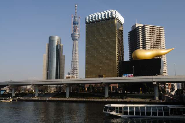 吾妻橋から見た東京スカイツリーの様子です。右側の金色