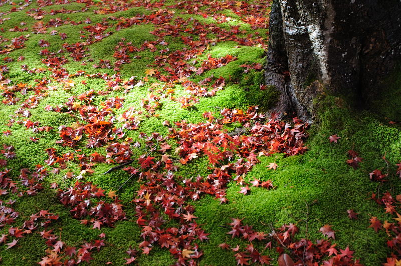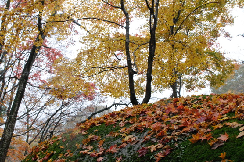 辺り一面に落ち葉が散らばっています。小雨ふりしきる中 暫し時を忘れてファインダーを覗いてました。 雨が止んで日が照ってきたので、再度廻りました。柔らかな 日差しが目に眩しく素晴らしい景観に感動して来ました。 【もみじ公園のいわれ】 もみじ公園は、旧宝幢寺は真言宗の大寺として、明治以 前まで1370石の御朱印領を、徳川将軍家より安堵されていた。 明治の神仏分離令の際、当時の宝幢寺の住職佐伯菅雄は、 神職となったので、宝幢寺は廃寺となった。現在の薬師公園 の薬師堂は、この宝幢寺の本堂を移築したものである。 この公園は遠州流の池泉回遊式の庭園で、これまで、 元禄頃の山形城主松平大和守(10万石)が、姫の病気平癒を 同寺の住職に祈願させたところ、病気がなおったので、 そのお礼に、十万石相当の庭を作ってやると約束して作ったのが、 この公園であると伝えていたが、最近、新史料の発見によって、 この庭は、もっと古い寛文の初め頃で、庭好きの松平下総守 忠弘(15万石)によって、自ら造園されたことが明らかとなった。 築山にあったもみじの巨木によって、もみじ公園の名称が つけられたが、この古木は近年惜しくも枯死してしまった。 |